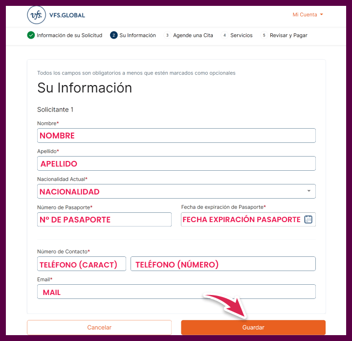 Una vez que dan en “Continuar”, pasan a la pestaña “Su información” y completan con sus datos personales y del pasaporte y hacen click en “Guardar”.