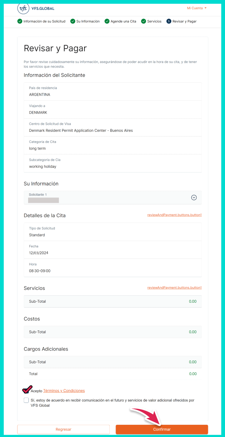 Ahí deberán pagar la Tarifa de procesamiento de VFS: El costo es de EUR 113 (ARS 191,677.63), y se paga en pesos argentinos.