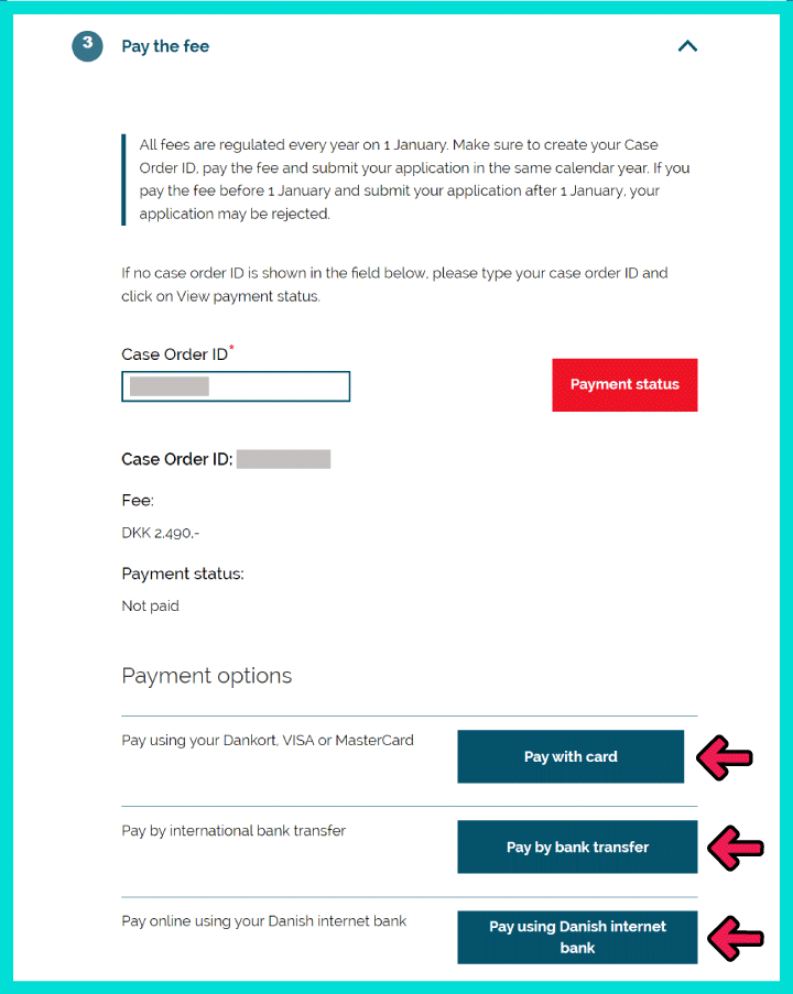 Les van a aparecer diferentes opciones para pagar la visa, a lo que ustedes deberán elegir la que prefieran, ya sea con tarjeta o transferencia. El arancel de la visa es de DKK 2255 (USD 352.32).