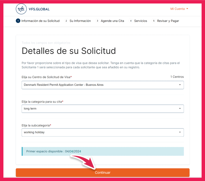 El turno se solicita en VFS Global Buenos Aires, ellos se encargan de recibir las solicitudes y enviarlas a migraciones en Dinamarca para que realicen el procesamiento de las mismas.
