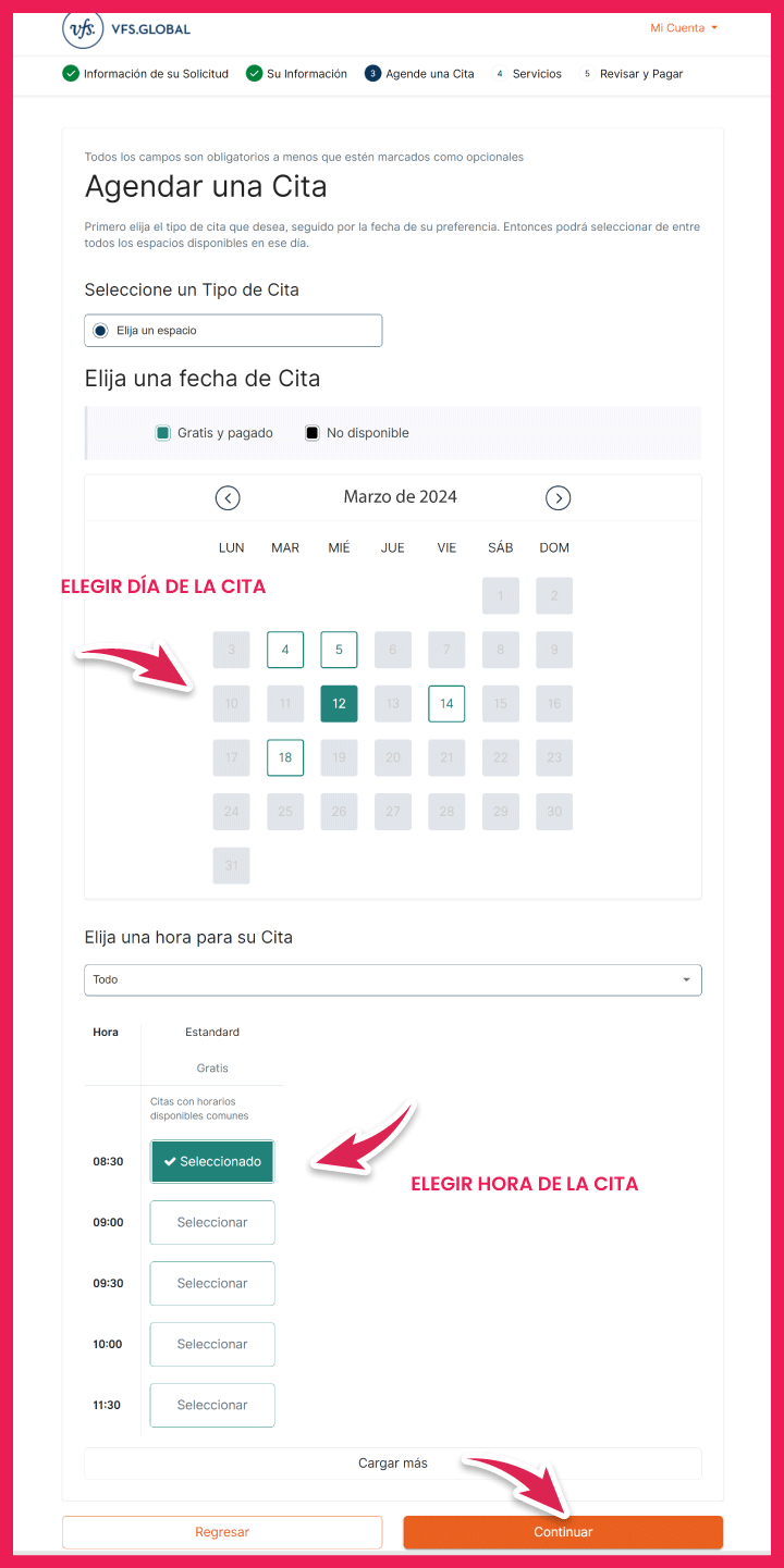 En la pantalla “Agende una cita”, elegirán el día y hora del turno. Una vez que seleccionen ambos, le dan a “Continuar”.