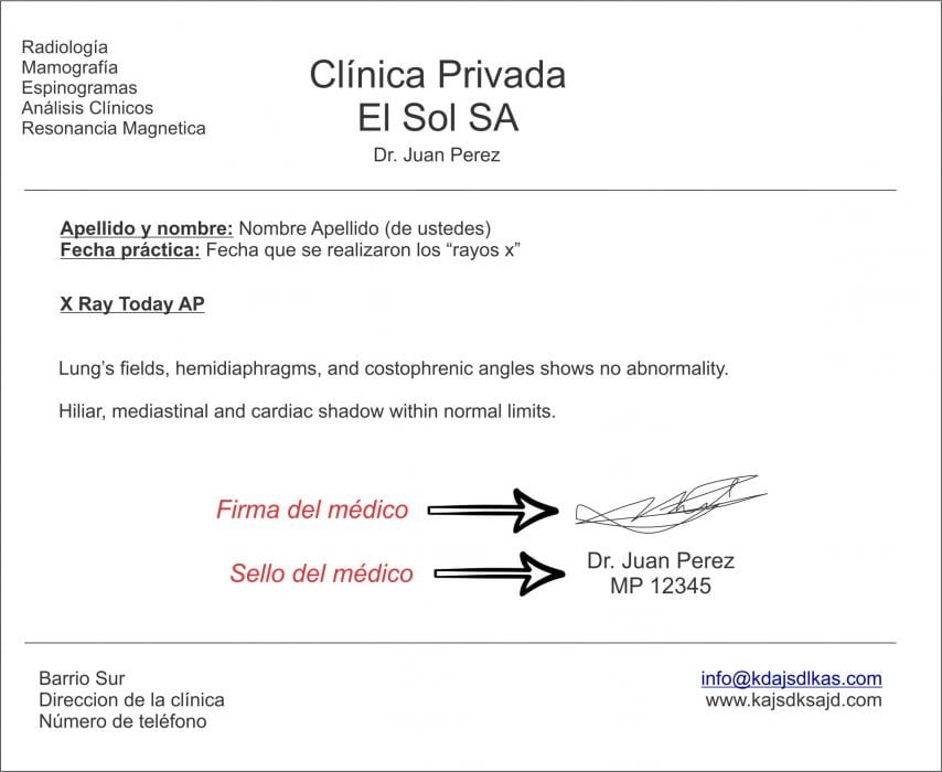 Con las placas de Rayos X en mano, deben solicitar al médico o radiólogo que los examine y que si todo está bien realice un informe que diga lo siguiente:
