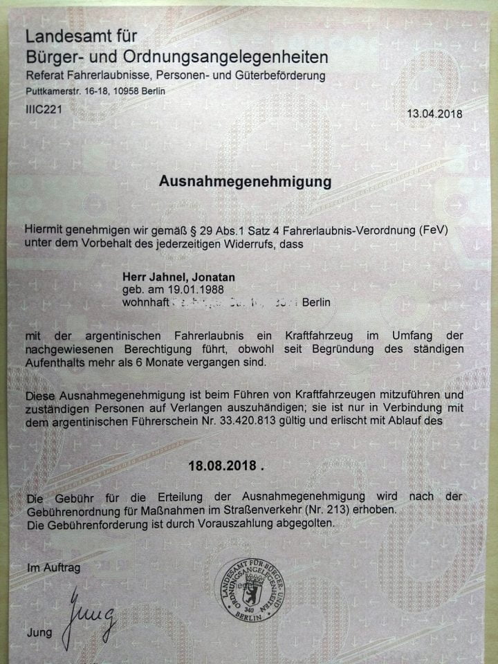 Acá entramos en un punto gris, desconocido hasta por alemanes empleados de las oficinas públicas. Jonatan por falta de información empezó el trámite de Umschreibung einer ausländischen Fahrerlaubnis aus einem Nicht-EU/EWR-Land (Drittstaat/Anlage 11), que es para inscribir el registro argentino y obtener el alemán. Ésto NO ES NECESARIO, por más que algunos les digan que sí, NO LO ES. Ni ellos saben bien el trámite que hay que hacer teniendo la visa Working Holiday.