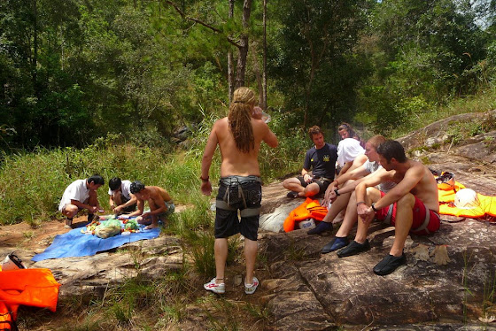 Y así salimos todo en una traffic (transporte) que nos pasó a buscar por el hotel para ir a las cataratas. Nos dieron un casco, un chaleco salvavidas y al agua pato!!!.. Pero antes de agua, un poco de práctica de como descender, en realidad solo 30 minutos de práctica y listo, ya supuestamente estábamos preparados.