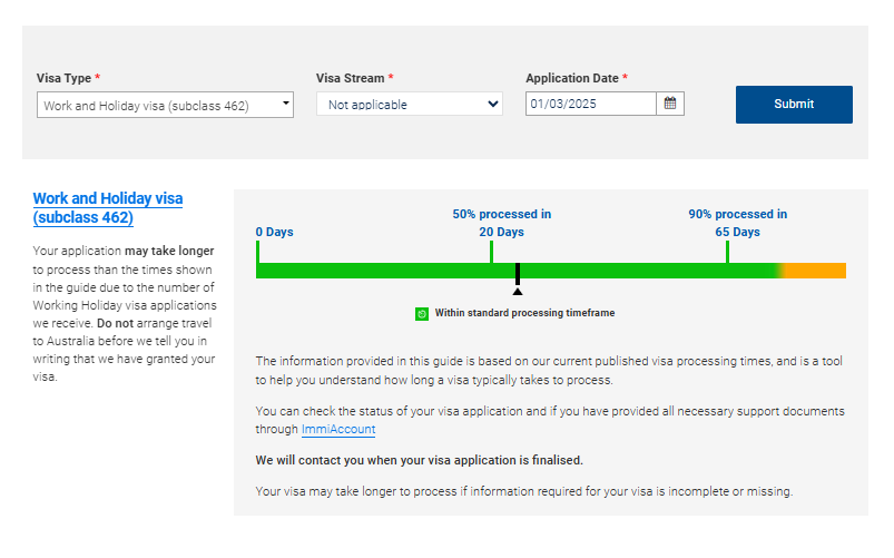 Abajo les compartimos un ejemplo suponiendo que aplicaron el 01/03/2025 a la Work and Holiday Subclass 462 y quieren saber cuánto puede llegar a demorar el procesamiento de la visa.
