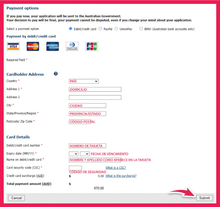 Una vez que pasan a la siguiente pestaña, tienen que abonar los AUD 670 (USD 435.57) que cuesta la visa.