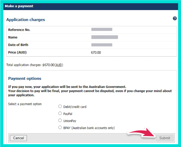 Una vez que hacen clic en “Submit” los van a redirigir a la web de Inmigración de Australia y les va a aparecer la siguiente pantalla: